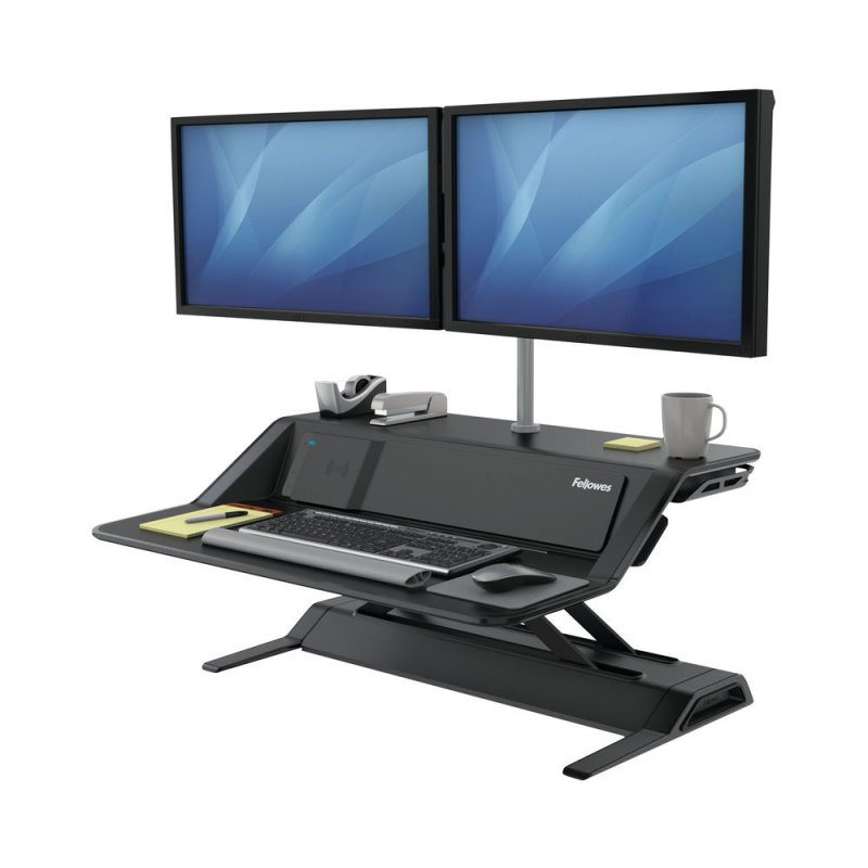 The Fellowes Black Lotus DX Sit-Stand Workstation takes your workspace to the next level with a built in charging station featuring wireless charging capabilities to allow effortless productivity.